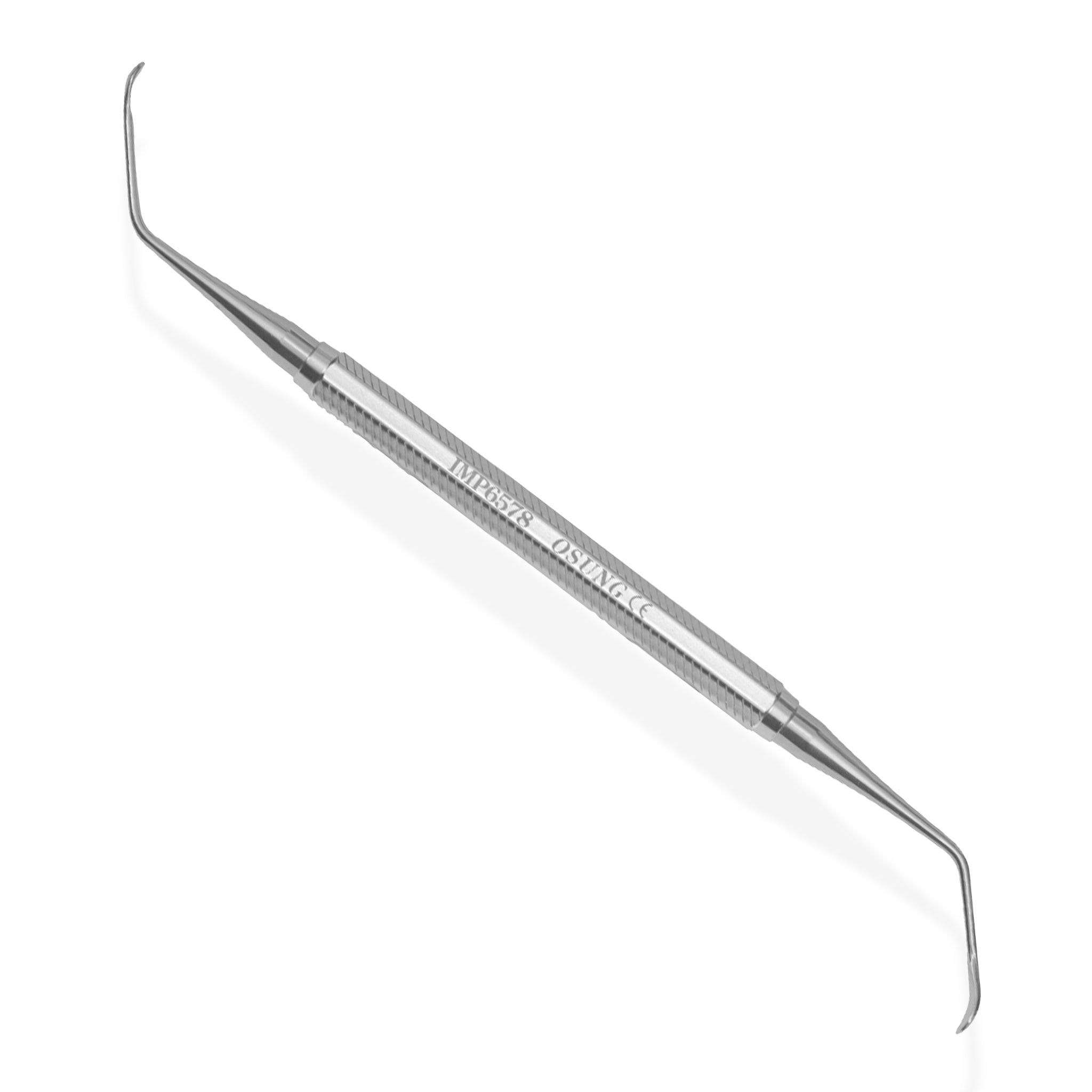 Kramer-Nevins Sinus Lift Instrument (IMP6578) for OBTUSE angles with SMALLER Spoon blades width on one side compared to IMP6578. Spoon Blades Width (4 mm/5 mm). The obtuse design will facilitate access to the mesial, distal, superior or inferior aspect. Designed to further separate the sinus lining from the bone, without fraying or tearing. IMP6578 or 6578
