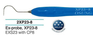 Dental Ex-probe, Ergonomic and Autoclavable Silicone Handle Instrument, XP23-8. This Ex-Probe is an excellent combination instrument for dental diagnostics. It has an explorer tip (EXS 23) on one end and a probe tip (CP 8) on the other. The probe tip has markings at 3, 6, 8, 11 mm. Product code: XP23-8 or sXP23-8
