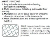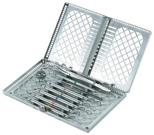 Dental Instrument Cassette, EFECAL-01. With lid. Made of stainless steel and polished for rust free performance. Dimensions 224mm x 141 mm x 25mm H. Has capacity for 8 instruments (max length 222mm). Items in picture can be ordered separately and not included with the cassette.